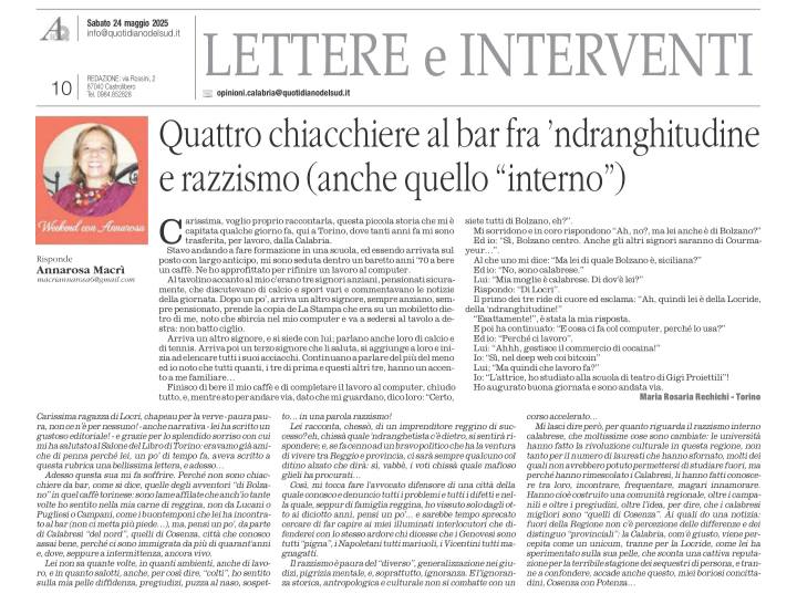 Perché non sono chiacchiere da bar, come si dice, quelle degli avventori “di Bolzano” in quel caffè torinese: sono lame affilate che anch’io tante volte ho sentito nella mia carne di reggina, non da Lucani o Pugliesi o Campani, come i buontemponi che lei ha incontrato al bar (non ci metta più piede…), ma, pensi un po’, da parte di Calabresi “del nord”, quelli di Cosenza, città che conosco assai bene, perché ci sono immigrata da più di quarant’anni e, dove, seppure a intermittenza, ancora vivo.